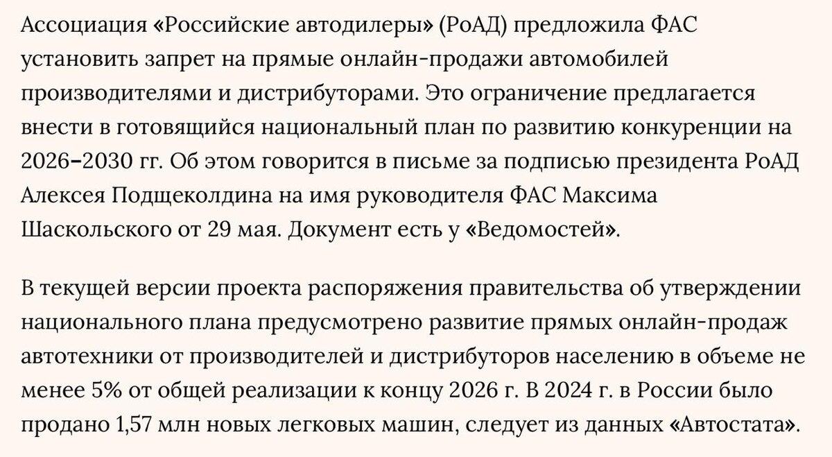 Лоббисты автодилеров хотят отменить обязательную 5-процентную норму прямых онлайн-продаж Что это значит? Наряду с риэлторами и салонами связи есть ещё один бизнес, который по всем правилам должен был остаться в далёком прошлом, но каким-то образом всё ещё цепляется за жизнь, не давая развиваться всей индустрии. Речь про автодилеров. Лет 30 назад без автодилеров было не обойтись. Где-то нужно было выставить машину, кто-то должен был привезти, растаможить и хранить новый автомобиль. Автодилеры были главным каналом маркетинга и продаж для автопроизводителей. Но время прошло, а автосалоны остались. Дилеры зарабатывают около 5% от стоимости автомобиля, затем в течение всей гарантии на сервисном обслуживании, на «допах», и ещё 30—40% на страховках и несолько процентных пунктов на кредитах. Весь «заработок» получается за счёт денег клиента. Что можно изменить? Можно ввести модель прямой продажи автомобиля: от производителя напрямую к клиенту. По такой модели работает Тесла: свои шоу-румы,