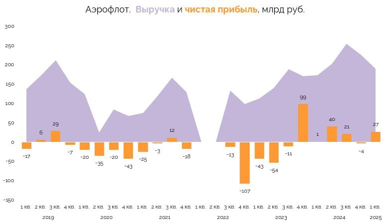 ✈️ Откуда у Аэрофлота деньги на дивиденды? В прошлую пятницу совет директоров Аэрофлота удивил рекомендацией выплатить дивиденды (впервые с 2019 года). Неужели инвесторам стоит присмотреться к этой компании и ждать роста акций? Мы не ждали дивидендов, поскольку не видели в них смысла: ФНБ предоставляет компании льготный лизинг на иностранные самолеты, а теперь часть этих льготных денег компания отправляет 5,27 руб. на акцию (8% дивдоходности) в пользу 25% миноритариев. Не кажется ли вам странным, что с одних компаний деньги качают через повышение налога, а другие — платят дивы из субсидий? Здесь нас покинула логика. Остается важный вопрос — что же дальше будет с котировками Аэрофлота? Поищем ответ в отчете за I кв. 2025 г.: — Выручка показала прирост на 9% г/г и составила 190 млрд руб. Основа роста — положительная динамика пассажиропотока и цен на билеты. Для бизнеса характерна сезонность с пиком результатов в III кв. — Обслуживание судов и пассажиров стало на 18% дороже (40 млрд