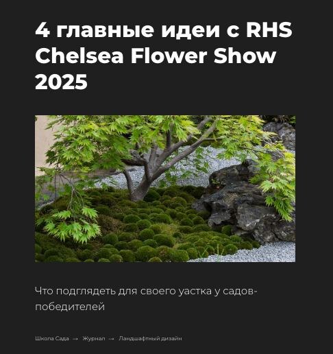 Каждый год в Лондоне дизайнеры показывают, каким может быть современный сад. Но Chelsea Flower Show — это не про недостижимую роскошь. Это про смысл. Про тишину. Про устойчивость. И про то, как меньше — значит больше. Мы собрали итоги выставки 2025 года с ориентацией на обычный дачный участок. Какие идеи стоит взять с собой? Почему бедные почвы — не беда? И как сад может стать местом покоя, а не бесконечной суеты? Читайте большой разбор тут: https://shkolasada.ru/razbor-show-chelsea-2025 🙌 Канал | Обучение | Услуги