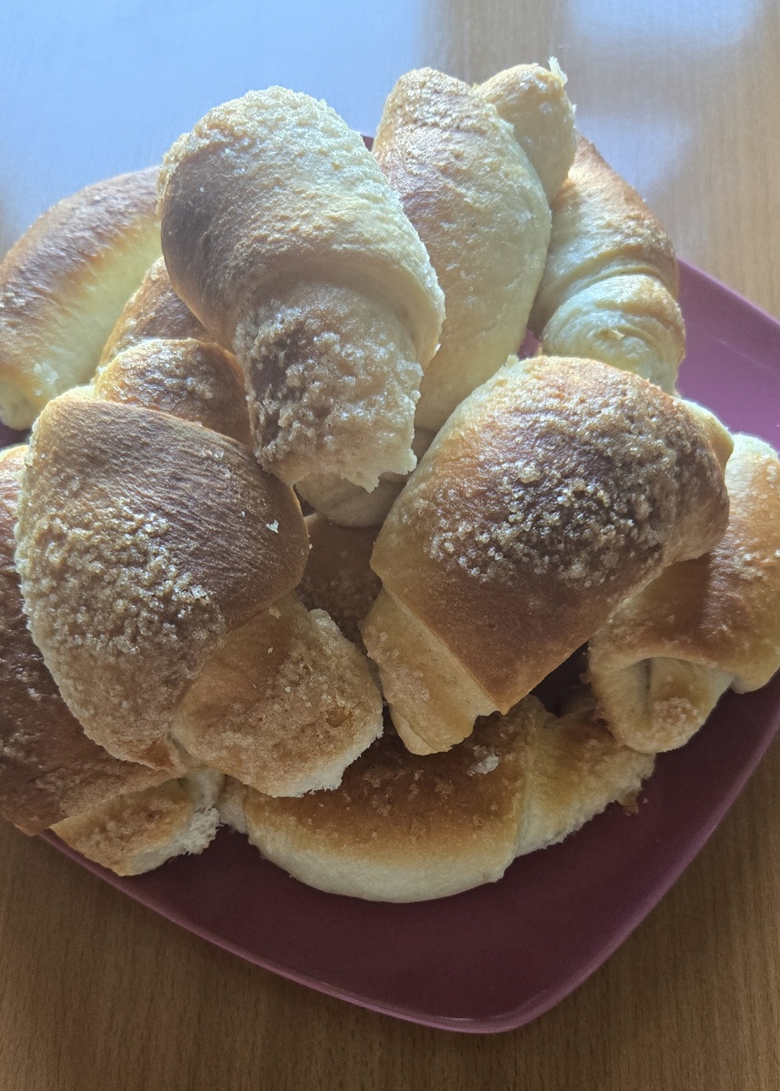 Сливочные рогалики на закваске 50 % влажности, с мармеладом. ✅250 гр закваски пшеничной 50% влажности (левито мадре) 300 гр холодного молока, из них 100 гр сливок 550 гр. пшеничной муки высшего сорта 50 гр сахара 50 гр сливочного масла комнатной t 5 гр соли ✅Мармелад для начинки Яйцо + молоко для смазывания рогаликов Сах.песок для обсыпки ✅Замесить тесто до гладкости руками или в планетарном миксере и положить в миску, смазанную маслом. 🛎Последовательность: в жидкость(молоко со сливками) добавить закваску, сахарный песок, соль и муку. Вымесить до полного объединения всех продуктов. Тесто получится довольно плотным. Затем, по - немногу, добавлять слив.масло до полного вмешивания его в тесто. ✅Оставить на брожение при комнатной t на 2 часа. Через 30 минут сделать 1 обминку. Далее поставить миску с тестом в холодильник на 4 - 5 часов для медленного подъёма. ✅Когда тесто хорошо поднимется, достать его на припылённый мукой стол, разделить и наформовать 12 круглых заготовок. ✅Дать