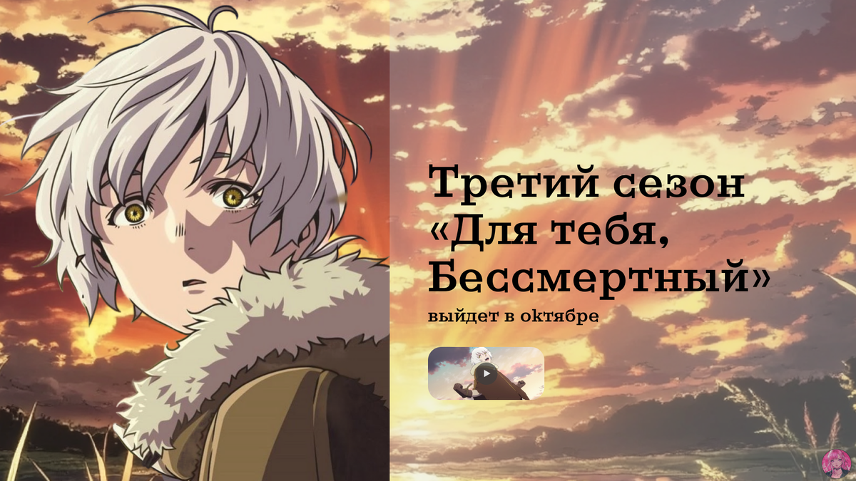 Твоя подписка и лайк — это огромная поддержка для меня! Я ценю каждого из вас и с радостью буду радовать новыми подборками и обзорами. Присоединяйся к нашему аниме-сообществу!🌸 Недавно был опубликован новый трейлер третьего сезона аниме «Для тебя, Бессмертный» (To Your Eternity). Премьера новых серий запланирована на октябрь 2025 года, подробности о дате выхода и расписании трансляций будут объявлены дополнительно. Тем временем стало известно, что оригинальная манга Ёситоки Оиме, по мотивам которой создаётся аниме, официально завершится 4 июня 2025 года. Это событие знаменует окончание долгой и эмоциональной истории, которая покорила сердца миллионов читателей и зрителей по всему миру. Третий сезон обещает продолжить глубокое и трогательное повествование, раскрывая новые грани главных героев и их путешествий. Фанаты с нетерпением ждут продолжения, чтобы узнать, как развиваются судьбы бессмертного Фуси и его спутников. Спасибо что дочитали статью!🌸 До новых встреч (⋈◍˃ᴗ˂◍)。✧♡