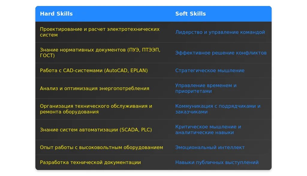 При анализе вакансии для начальника электротехнического отдела важно разделить требования на обязательные и желательные. **Обязательные требования** включают профессиональные навыки, такие как опыт управления командой, знание нормативных документов (например, ПУЭ, ПТЭЭП), и технические компетенции (проектирование, эксплуатация электрооборудования). **Желательные требования** могут включать знание специализированных программ (AutoCAD, EPLAN), опыт внедрения систем автоматизации или сертификаты (например, NABCEP).