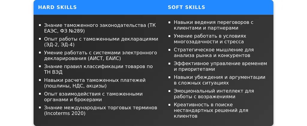 Навыки для акцента: Коммуникабельность, обучаемость, базовые знания таможенного законодательства.