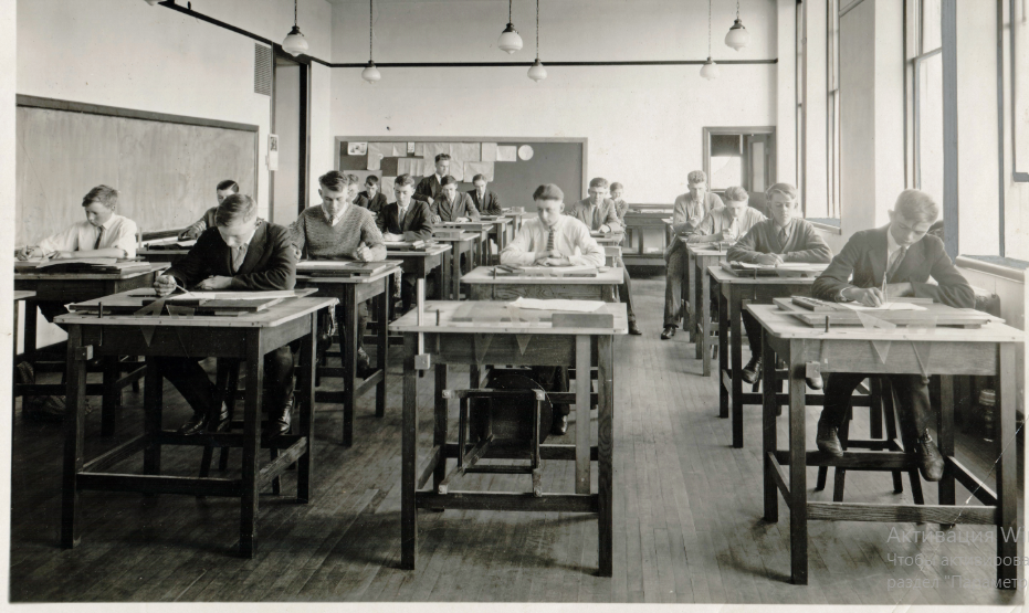 День добрый! Последние путешествия по сети дали ещё массу старых фотографий различных студий, учебных заведений, КБ и различных бюро, где трудились чертежники, инженеры, архитекторы, художники и иллюстраторы. Так что Я снова готов поделиться с Вами этими находками. Все фотографии из открытых источников. 1. Чертежный класс в Galt Collegiate Institute, 1920-е года. Пусть словосочетание "Collegiate Institute" не вводит Вас в заблуждение, это не ВУЗ, а просто школа с завышенными требованиями и то термин прижился только в Канаде. Приглядимся к столам, они мега простые. Отличает их наверно только место под планшет и вырез для чертежных принадлежностей, на фото как минимум каждый ученик был снабжен двумя угольниками. Тулья высокие, так что ноги ученикам нужно было ставить на перекладины стола. Настольного света нет но над каждым учеником висело по лампе. 2. Чертежники в AERL, центре Лэнгли. Просторная студия, огромные окна с верхним подвесом. Отметим отсутствие ламп на столах. По моему мнени