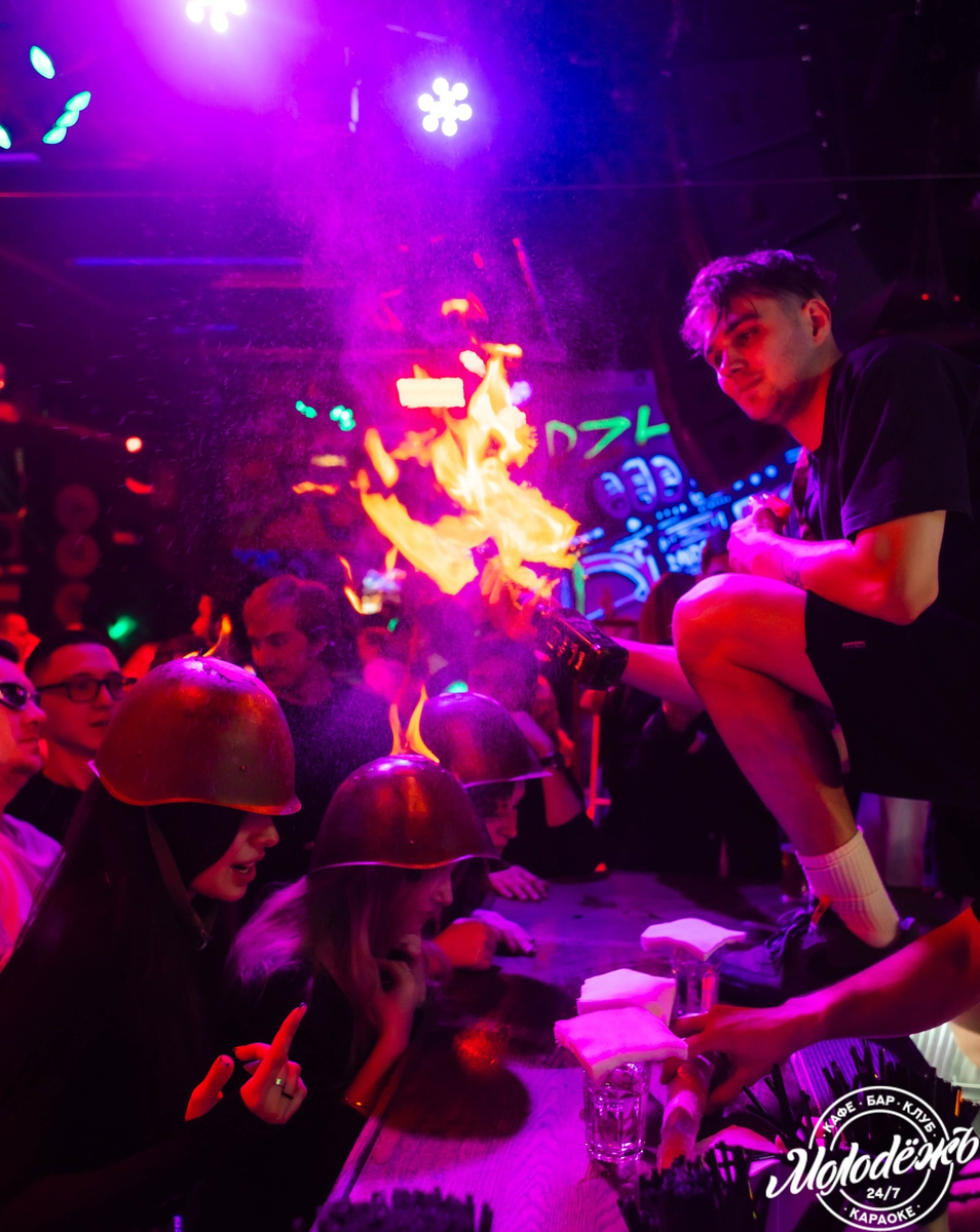 мы уже в неё влетаем с танцем! Сказ о «Молодёжи», что никогда не спит. В некотором царстве, в студенческом государстве, меж двух станций метро – «Менделеевской» и «Новослободской» – стояло место легендарное. Не кафе, не бар, не ночной клуб и даже не караоке — а всё сразу, в одном месте. Звали его просто: «Молодёжь». Но место это было волшебное. Оно никогда не спало. Пока другие заведения утомлённо гасили свет, здесь разжигались танцы, звенели бокалы, щёлкали вспышки фотокамер и кипела кухня, будто заколдованный котёл. 🍳 Кухня, что варит даже во сне В «Молодёжи» трудилась волшебная кухня – 24 часа в сутки, 7 дней в неделю, 365 дней в году. Ходили слухи, что ею управляет бренд-шеф, повидавший пять кулинарных миров, которые в 118 блюдах меню и отразились. Днём здесь случались чудеса: бизнес-ланчи от 150 рублей. А если попадёшь с 10