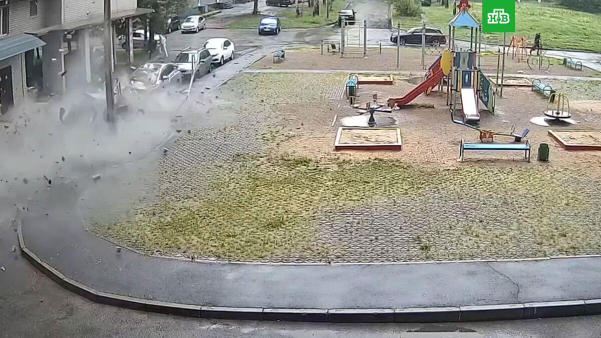 Ведомство опубликовало кадры с камер видеонаблюдения. На них видно, что кирпичи упали с фасада здания и придавили две припаркованные машины. За секунду до этого во двор дома зашла женщина, она успела отбежать в сторону, когда перед ней упали обломки.