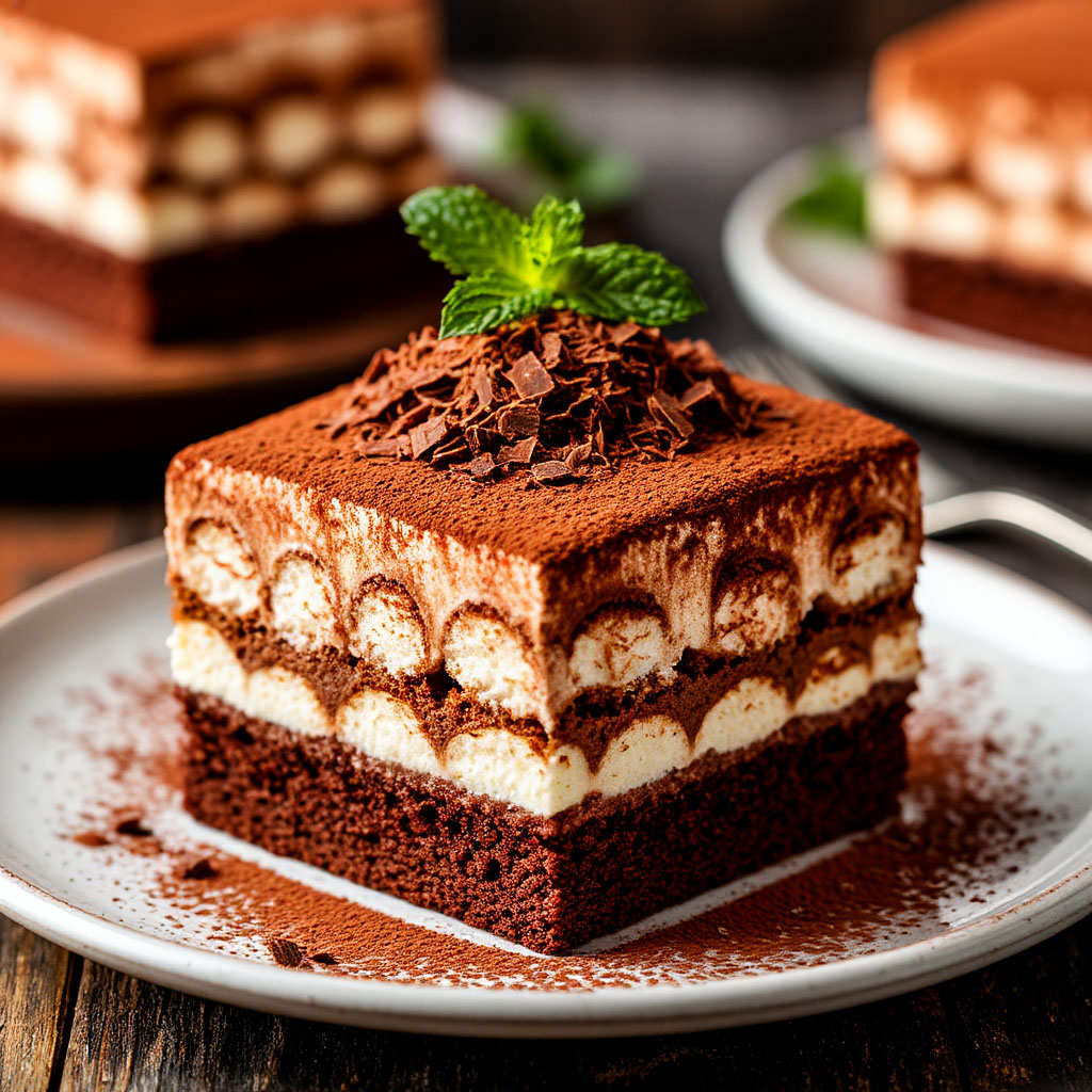 Бисквит: Разогрейте духовку до 180°C. Смажьте маслом и присыпьте мукой форму для выпечки (примерно 20х20 см). В большой миске смешайте муку, какао-порошок, разрыхлитель, соду, соль и сахар. В отдельной миске смешайте растительное масло, теплую воду и ванильный экстракт. Влейте жидкие ингредиенты в сухие и перемешайте до однородности. В конце добавьте уксус и быстро перемешайте. Тесто немного запузырится. Вылейте тесто в подготовленную форму и выпекайте 25-30 минут, или пока зубочистка, вставленная в центр, не выйдет сухой. Дайте бисквиту полностью остыть в форме, затем разрежьте его на кубики или полоски. Создаем нежный крем: Взбейте маскарпоне с сахарной пудрой и ванильным экстрактом до однородной массы. В отдельной миске взбейте холодные сливки до мягких пиков. Аккуратно соедините маскарпоне и взбитые сливки, перемешивая лопаткой снизу вверх, чтобы сохранить воздушность. Собираем тирамису: Смешайте кофе с кофейным ликером (если используете). Обмакните каждый кусочек бисквита в кофейн
