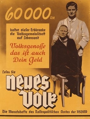 Пропагандистский плакат 1938 года, опубликованный в ежемесячном журнале Бюро расовой политики НСДАП, изображающий больного человека, гласил «Этот больной за время жизни обходится народу в 60 000 рейхсмарок. Гражданин, это и твои деньги!». Пропагандистские плакаты, изображающие обузу нетрудоспособных людей, имели широкое распространение в годы нацизма.
