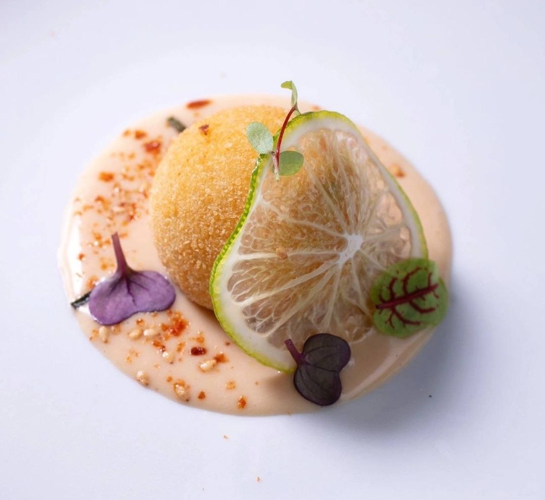 #Закуска *Шарики из палтуса с творожным сыром* 📝Ингредиенты: Палтус 90 гр Сыр творожный 30 гр Соус Перечный 10 гр Для маринада: Соус соевый 10 гр Масло оливковое 10 гр Соль 1 гр Перец молотый 1 гр Сок лимона 5 гр Сухари панировочные 60 гр Яйцо куриное 3 шт. Соус сырный: Сыр плавлений Виола 30 гр Сливки 50 гр Технология: Сделать маринад (соевый соус,соль,перец,сок лимона, олив., масло хорошо перемешать) и замариновать палтус.Оставить на 5 мин.🔥⏱️Выложить рыбу на противень с пергаментом и запекать при t180C° 8 мин. Достать готовый палтус и дать остыть до комнатной температуры. Далее, рыбу размять до однородной массы, добавить творожный сыр и перечный соус,хорошо перемешать. Разделить массу на 3 части, сформировать шарики и запанировать. Для панировки взять две тарелки,в 1 положить измельчёные панировочные сухари,в 2 ,яйца (яйца хорошо взбить). Далее,рыбный шар опустить в панировочные сухари. Жарить во фритюре 5 минут до золотистой корочки. Выложить на бумагу. Ваш вкусный шеф 🔪 ht
