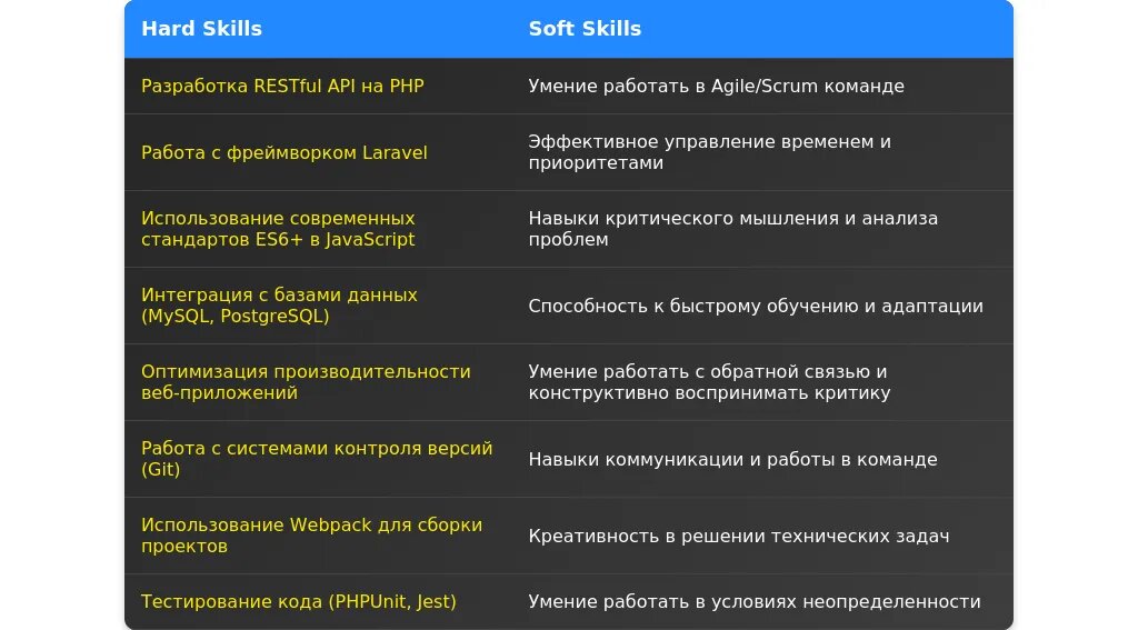 Пример 1: В вакансии указано: "Опыт работы с PHP 8 и Laravel обязателен". Это явное обязательное требование.