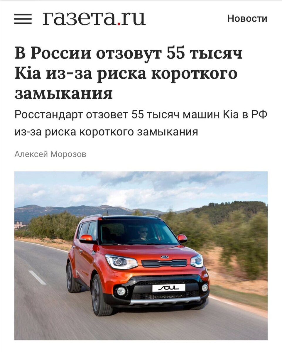KIA отзывает 55 тысяч машин в России из-за риска короткого замыкания,Росстандарт. Всего три модели: кроссоверы Sorento, Soul и седаны Cerato, проданные с 2010 по 2016 год. Неисправность обнаружена в блоке ABS — она может привести к пожару моторном отсеке. Все работы проведут бесплатно.