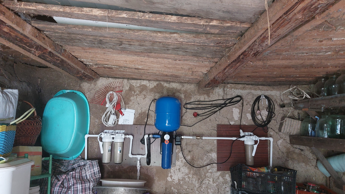 Вернее, водопровод пришлось смастерить, без него никак не обошлись. Изначально планировали, что вода будет поступать самотеком из бочки душа, и это был бы супер-эконом вариант. Но почему- то в процессе установки было принято решение, что нужно еще докупить насосную станцию, которая бы обеспечила закачивание воды в машинки. Мы приехали в местный Энкор, там нам посоветовали купить отдельно насос для скважины и еще какую –то помпу, которая будет обеспечивать давление, что ли. И эта конструкция лучше переживет зиму и работает тише. В общем, я в этом не сильна, знаю только, что обошлось нам это все вместе с трубами, кранами, фильтрами и всем, всем, всем примерно в 30 тыс. руб. Если бы я знала, я бы сто раз подумала, ведь сами машинки стоили нам всего 10 тыс. руб. обе. Но отступать было некуда, все купили, и за два дня Рома смастерил такую насосную станцию для подачи воды. Вся эта конструкция находится в старом сарайчике, там она никому не мешает, и глаза не мозолит. Все установили и запусти