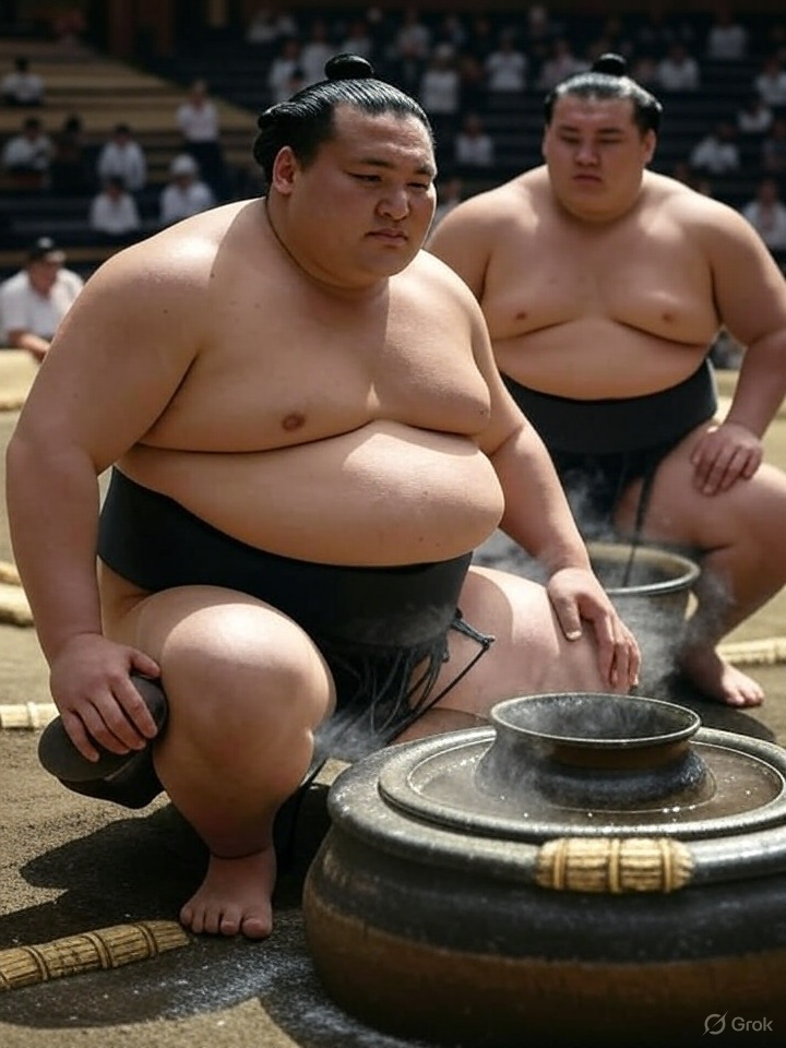 - Хотя питание играет ключевую роль в наборе массы, тренировки помогают сумоистам наращивать не только жир, но и мышечную массу. Утренние тренировки начинаются в 5 утра и длятся около 5 часов. Они включают силовые упражнения, растяжку и спарринги, часто на пустой желудок, чтобы снизить метаболизм и усилить аппетит. Тренировки крайне интенсивны, что делает сумоистов сильными и выносливыми, несмотря на их внешний вид.