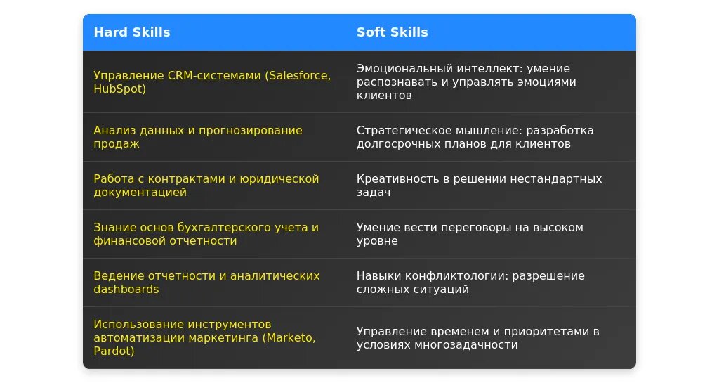 После: "Навыки управления ключевыми клиентами, работа с CRM (Salesforce, Bitrix24), аналитика продаж."