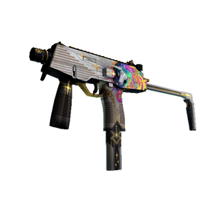 MP9 — штурмовой пистолет-пулемет с высокой точностью и эффективностью на средних дистанциях. Скин украшен изображением единорога с радужной гривой на белом фоне, дополненным золотыми акцентами. Этот скин сочетает в себе элегантность и магию.