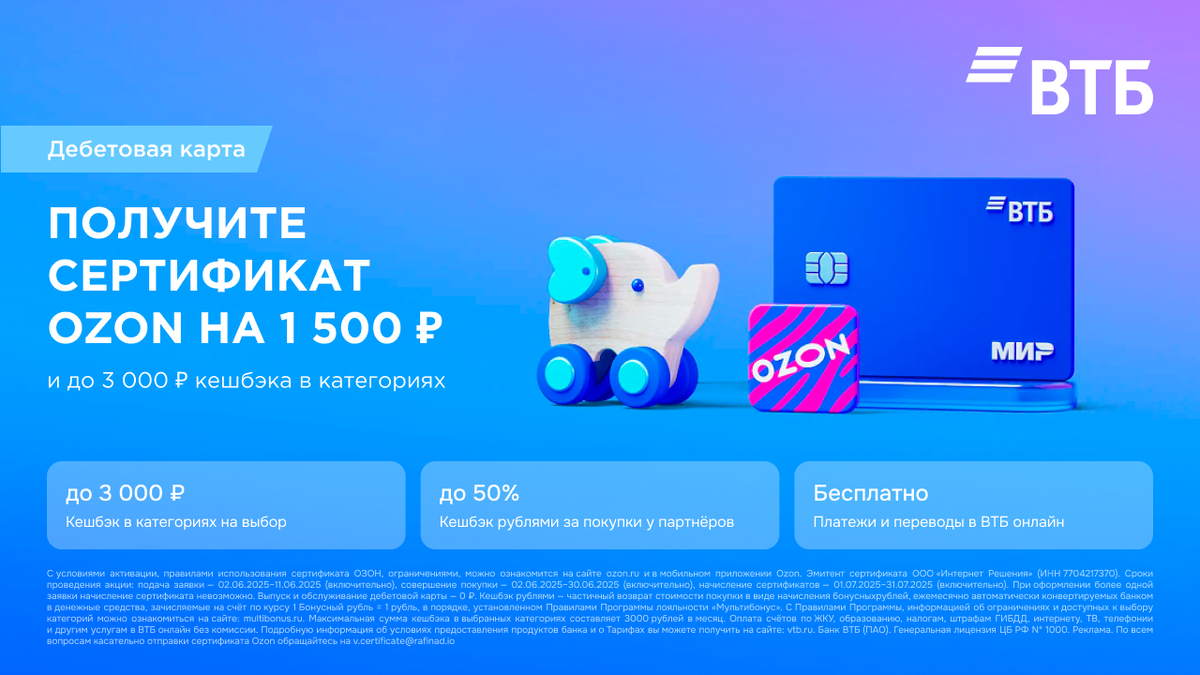 Сертификат на 1500₽ в Ozon за оформление бесплатной дебетовой карты ВТБ