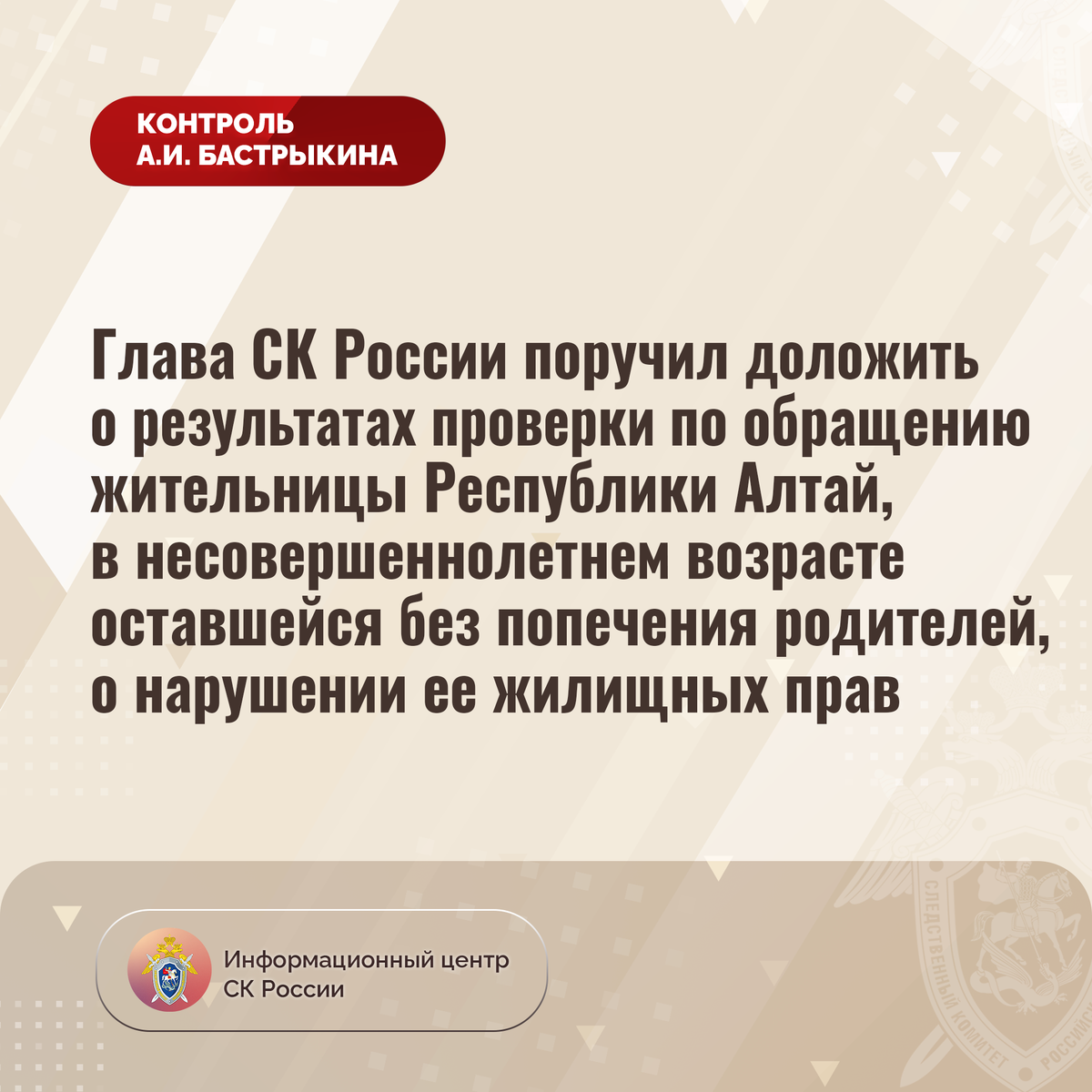 Глава СК России поручил доложить о результатах проверки по обращению жительницы Республики Алтай, в несовершеннолетнем возрасте оставшейся без попечения родителей, о нарушении ее жилищных прав В Информационный центр СК России обратилась жительница города Горно-Алтайска Республики Алтай, в несовершеннолетнем возрасте оставшаяся без попечения родителей, по вопросу длительного необеспечения ее положенным по закону жилым помещением. Женщина с 2011 года состоит в специализированной очереди. Несмотря на решение суда, вступившее в законную силу в 2020 году, до настоящего времени ее права не реализованы. Многочисленные обращения заявительницы, имеющей на иждивении пятилетнего ребенка, результатов не принесли. В СУ СК России по Республике Алтай по поступившему обращению начата процессуальная проверка. Председатель Следственного комитета Российской Федерации Александр Иванович Бастрыкин поручил и.о. руководителя СУ СК России по Республике Алтай Константину Борисовичу Мальцеву доложить о результа