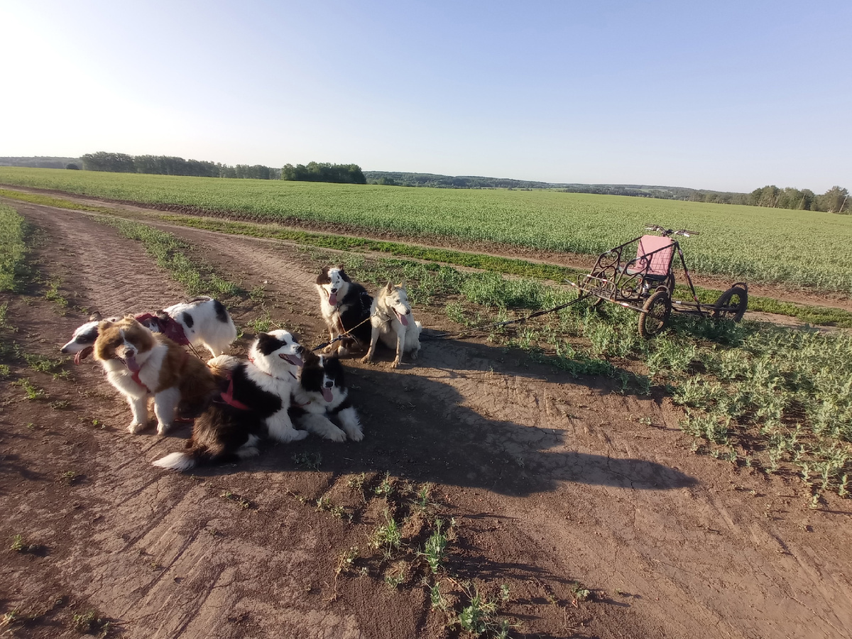 Когда мой будильник прозвонил в 4.50 утра, я чуть было не дала слабину и не отказалась от утренней поездки на карте: спалось плохо (и мало после вчерашних чтений в «Читай-городе), чувствовала себя неважно… Но мой внутренний любитель делать все по плану стащил меня с кровати и довел до ванны. А так как-то дело легче пошло. Следующий вызов – запрячь одной упряжку в карт. Дело в том, что у летнего аналога нарт нет якоря (да и в сухую землю его особо-то не вобьешь – по крайней мере моими силами), а это значит, что его надо либо к чему-то привязывать, либо полагаться на выдержку собак. Первое не только не всегда возможно (трудно найти что-то, к чему можно привязать карт, посреди полей), но и не так-то просто: карт должен легко и быстро – буквально одним движением одной руки – отвязываться, но веревка при этом должна удерживать упряжку собак и не затягиваться. А я, сколько бы в походы ни ходила, так и не овладела веревочно-узловой наукой (зато оказалась смышленой и креативной, но об этом поз