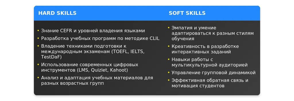 На что делать акцент: Навыки преподавания, коммуникабельность, знание языков и стремление к развитию.