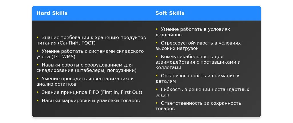 После адаптации: "Знание WMS-систем, управление погрузочной техникой, знание стандартов хранения продуктов питания."