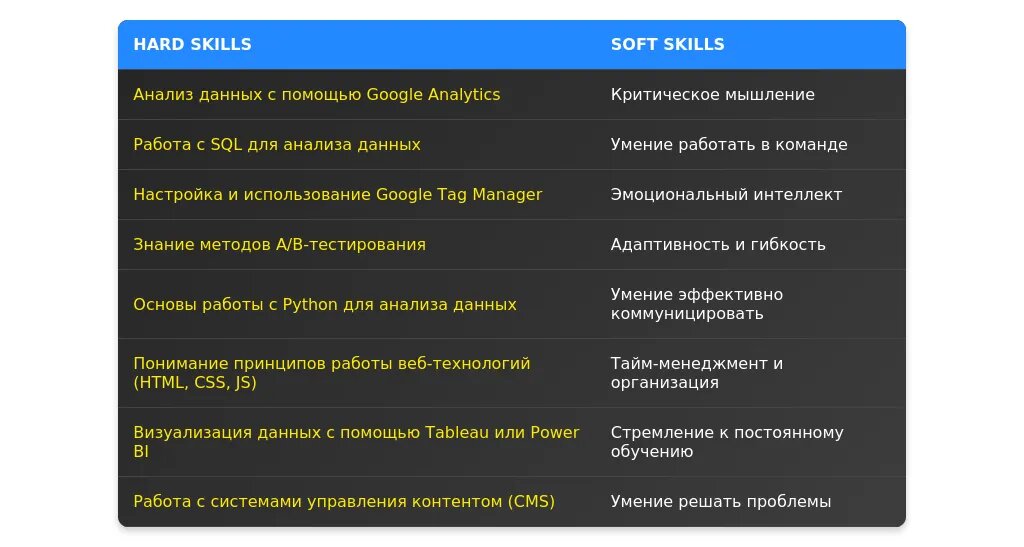 - Советы по включению актуальных для веб-аналитики навыков и достижений.