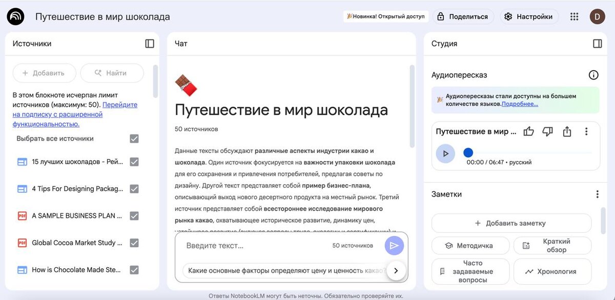 Как учить что-либо лучше, глубже и интереснее? С ИИ. У гугла есть очень крутой инструмент NotebookLM. (Нужен VPN) Устроено это так: 1. Загружаете имеющиеся у вас источники. Книги, пдфки, статьи, доки, ссылки на сайты. 2. Если нужны еще какие-то источники - то также есть поиск по источникам из интернета на любом языке. Всего можно присоединить 50 источников. 3. После этого у вас появляется собственная база данных с нейросетью, которая ищет именно по этим файлам и только по ним. Можете задавать вопросы в чат текстом и получать ответы как чатгпт. 4. Можно сделать mindmap по всей теме, получить хронологию событий, методичку по изучению. И киллер-фича - это создание подкаста на изучаемую тему. Он генерирует разговор/подкаст двух людей на 6 минут, за которые проговаривают все нюансы темы. (В следующем посте прикреплю аудиозапись) А еще они анонсировали, что скоро можно будет прям врываться в их подкаст, задавать вопросы, и они будут отвечать. Мне кажется, что для глубокого погружения в
