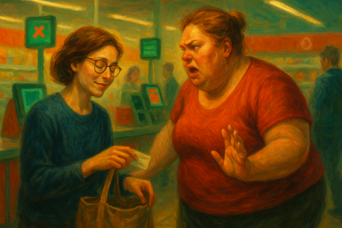 Стою на кассе самообслуживания в «Пятёрочке». Покупок немного: тёмный шоколад, пачка гречневых хлебцев, зубная нить — тихая триада взрослой жизни, где удовольствие, пища и гигиена живут в равновесии. Рядом женщина. Крупная. Взгляд быстрый, лицо напряжённое. Что-то не так пробилось, и она вызывает продавца. Продавец не идёт. Женщина нервничает, ворчит, начинает пятиться, чтобы выглянуть в зал и ускорить процесс. В этот момент она всем весом становится мне на ногу. Не специально, но абсолютно уверенно. Я резко выдёргиваю ногу. Боль моментально сбрасывает автоматизм. Я — есть.