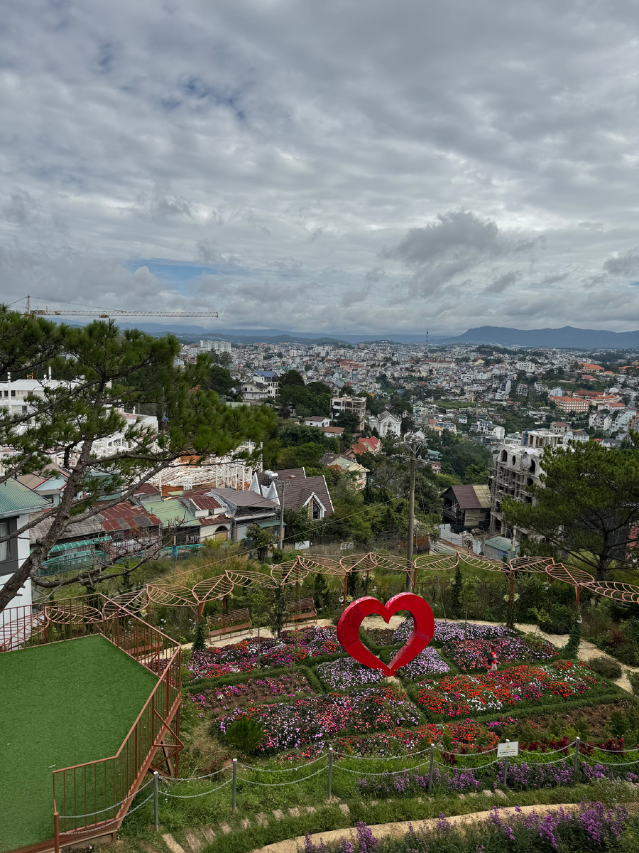 На третий день нашего пребывания в Нячанге мы отправились на экскурсию в город Далат. Выехали с острова Винперл в 4 утра, вместе с чемоданами загрузились в автобус и поехали. Дорога занимает 3 часа с остановкой через час на завтрак. Далат расположен на уровне 1475 м над уровнем моря. Его называют городом вечной весны и городом тысячи цветов. Именно Далат является поставщиком цветов во многие регионы Вьетнама. Климат в Далате намного мягче и здесь нет такой влажности, как в Нячанге. Во времена колонизации Далат заселили французы и они внесли очень большой вклад в развитие города: завезли уникальные сосны (воздух здесь удивительный), артишок и кофе. Ведь для выращивания по-настоящему хорошей арабики нужна высота не менее 1200 м над уровнем моря, а тут аж 1475м. Город очень красивый, строится много отелей, молодожены считают престижным провести здесь медовый месяц. Сначала привозят на смотровую площадку, откуда открываются неплохие виды на панораму внизу. Есть несколько фото зон, где все