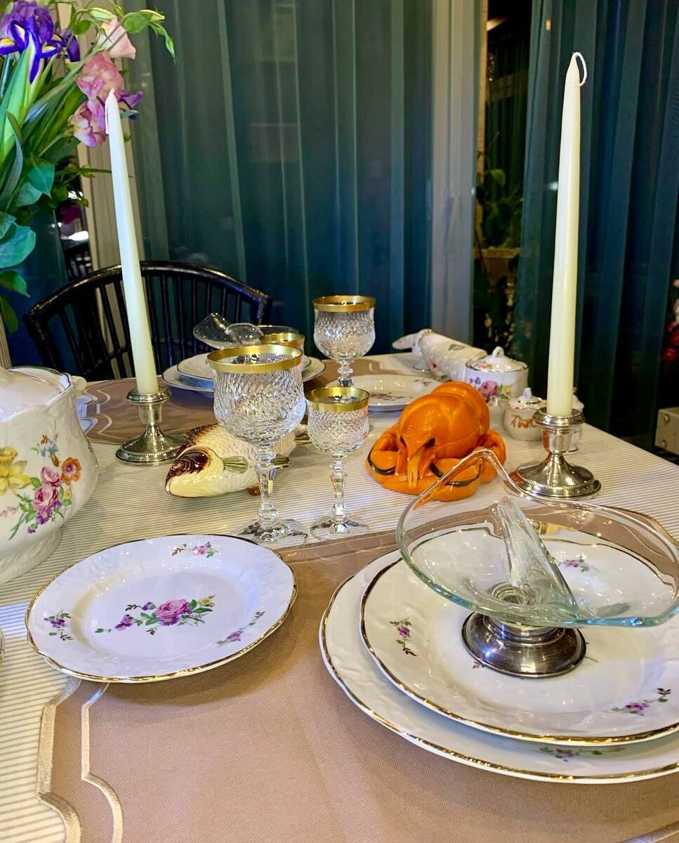 Продолжим «рыбную» историю. И на этот раз при сервировке я использовала маслёнки тромплей. Но не по тому назначению, которое им определили мастера фабрик М.С. Кузнецова. «Масленка карасем» (номер 1351 Каталога предметов М.С. Кузнецова) прекрасно сработала ёмкостью для форшмака. В «масленке раком» удобно расположилось мясо краба - ближайшего родственника рака. Изменив назначение этих предметов, я дала им вторую жизнь в новой сервировке. Тем самым, украсив ее обыденность. Сервиз значительно моложе предметов Кузнецова, ему немногим более 50 лет. Изготовлен сервиз на Барановском фарфоровом заводе, проработавшем с 1802 по 2013 год. Какие невероятные предметы выпускал этот завод до революции. Да и при Советской власти завод славился качественным фарфором, который выпускался в огромных количествах. После приватизации произошёл резкий спад производства, а в 2009 году продукцию прекратили выпускать окончательно. Мои «рыбные» истории получились совершенно спонтанно. Просто совпали гости, пришедш