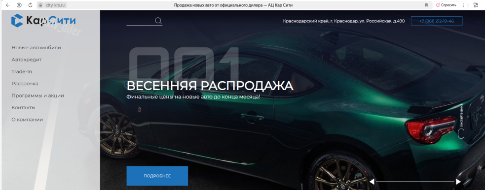 Кар Сити — это автосалон в Краснодаре. На сайте указан адрес, по которому официально находится дилерский центр Класс Авто (он в нашем черном списке). Больше причин не доверять новому дилеру — в нашем обзоре. В рекламе начал активно появляться автоцентр Кар Сити. Однако на Я.Картах по указанному адресу находится Класс Авто — дилер из нашего черного списка. Еще на прошлой неделе мы обнаружили, что сайты этого салона недоступны, а отзывы на картах перестали публиковаться 17 мая. Потому мы считаем, что Кар Сити — это новое название дилера, репутация которого безнадежно испорчена. В автосалоне на Российской улице 490 в Краснодаре можно купить как новый, так и подержанный автомобиль. Авто продаются с большими скидками. Так, например, новую Ладу Гранту седан обещают продать за 545 000 рублей, хотя ее реальная стоимость давно превышает 1 000 000 рублей. В честь чего такие скидки? На сайте есть раздел с акциями, но правила не расписаны. Публичная оферта отсутствует. У нас нет оснований считать,