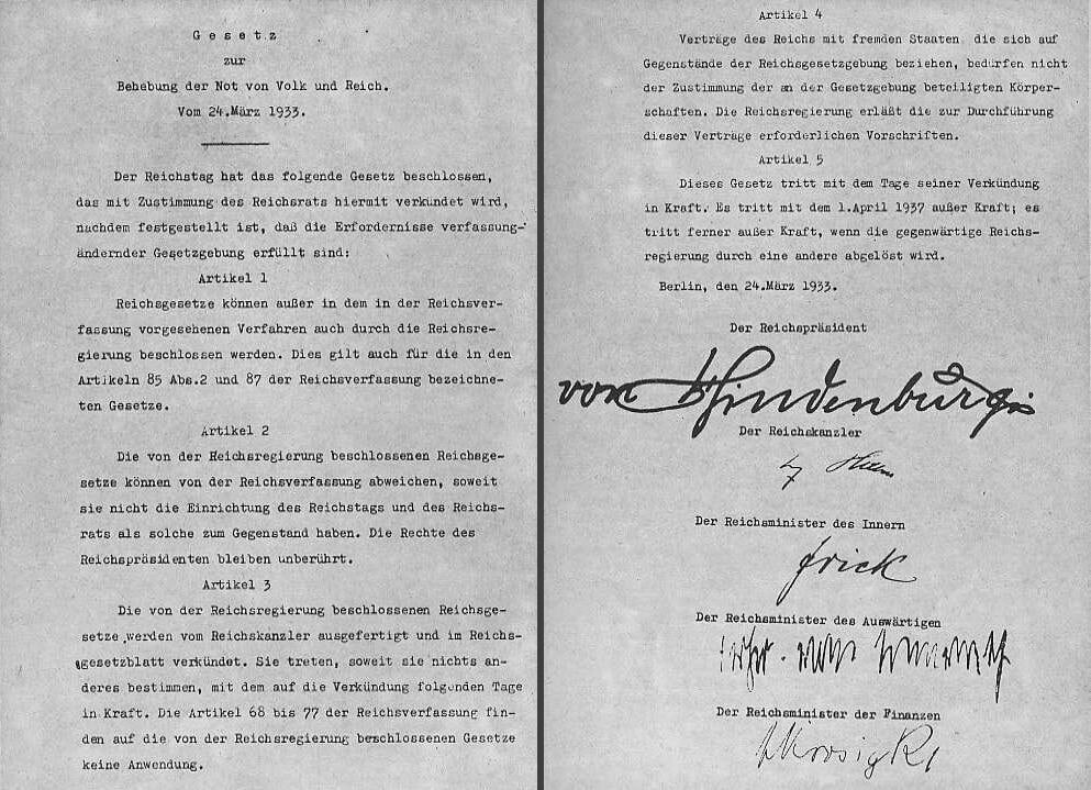Полное название: Закон об устранении бедствий народа и государства (нем. Gesetz zur Behebung der Not von Volk und Reich), также известен как Закон о чрезвычайных полномочиях (Ermächtigungsgesetz). Дата принятия: 23 марта 1933 года рейхстагом, утверждён президентом Гинденбургом 24 марта 1933 года . Юридический статус: Предоставлял правительству во главе с Адольфом Гитлером право издавать законы без участия парламента, включая нормы, противоречащие Конституции Веймарской республики. Исторический контекст: Как создавались условия для диктатуры 1. Использование статьи 48 Конституции: За месяц до принятия закона, 28 февраля 1933 года, президент Гинденбург подписал Декрет о защите народа и государства (Reichstagsbrandverordnung). Он отменял ключевые гражданские свободы (неприкосновенность личности, тайна переписки, свобода собраний) под предлогом борьбы с «коммунистической угрозой» после поджога Рейхстага 27 февраля . Это создало правовую основу для массовых арестов оппозиции. 2
