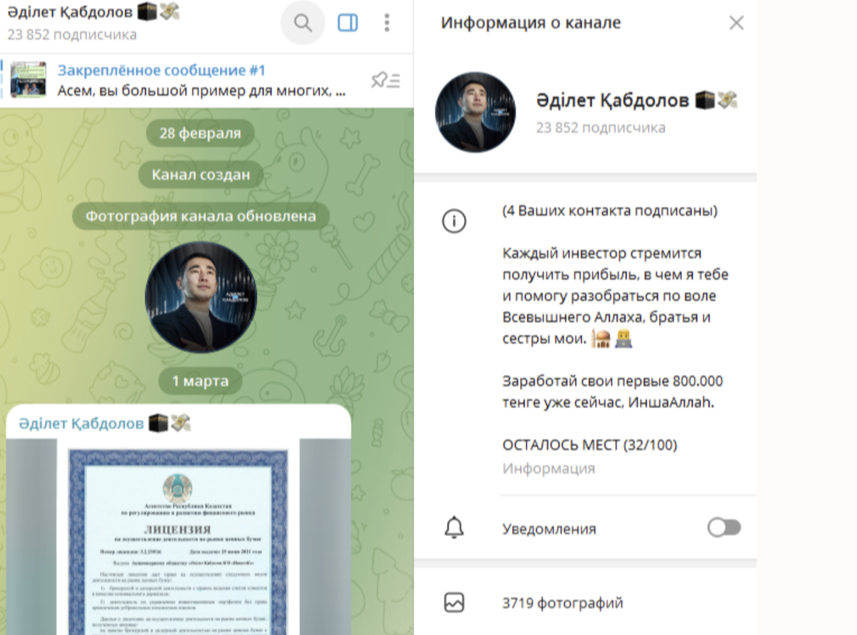 Проверяем очередной «инвестпроект без обмана», который появился из ниоткуда, моментально набрал десятки тысяч подписчиков и теперь обещает вам миллионы тенге с минимального вклада. Разбираем, кто такой Adilet Kabdolov, что за канал Adiiet Lco и стоит ли туда нести свои деньги. Спойлер: вряд ли. ✅Рекомендуем проверенный способ заработка без обмана: Переходи в проверенный канал: https://t.me/+BmUdHX0TrFhmMmQy