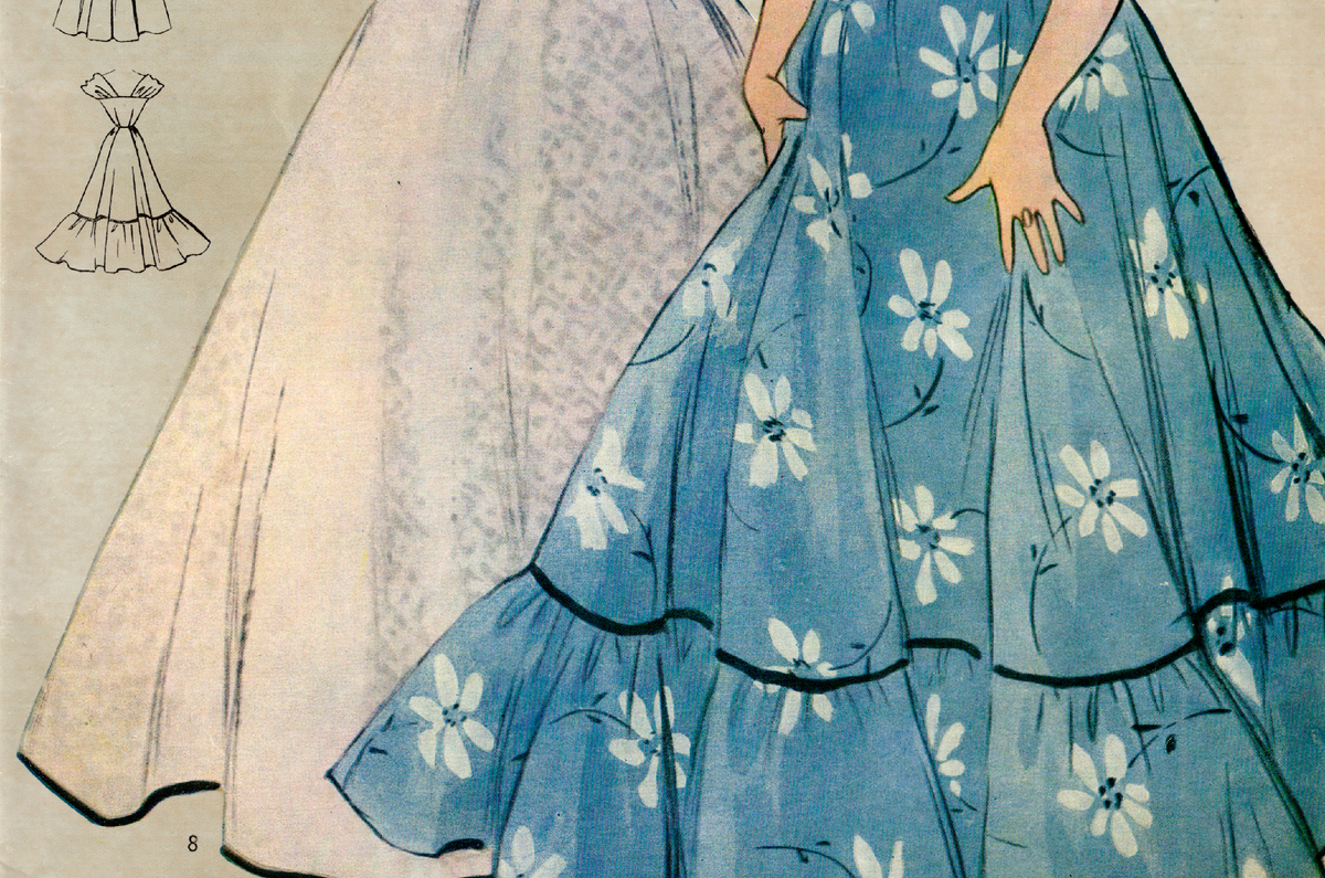 Статья из "Журнала мод" №2 1955 года. Летний сезон 1955 года характерен широким распространением платьев с узким, прилегающим лифом и пышной расклешенной юбкой. Такой силуэт платья делает фигуру более женственной и стройной. Но, как известно, не всякая ткань хорошо держит форму. Из-за этого не всегда удается придать юбке достаточную пышность. В таких случаях необходимой принадлежностью женского туалета становится нижняя юбка. На Международном конкурсе моделей одежды в Будапеште, состоявшемся осенью прошлого года, художники-модельеры Советского Союза и ряда стран народной демократии продемонстрировали образцы нарядных выходных платьев с нижними юбками. Они отлично сохраняли свою форму на фигуре и выглядели очень эффектно. Здесь мы хотим дать читателям „Журнала мод“ несколько практических советов о том, как шить и применять нижние юбки. Их можно шить из плотного шелка или из плотных хлопчатобумажных тканей (типа репса или тафты). Если для нижней юбки используется ситец или другая мягкая