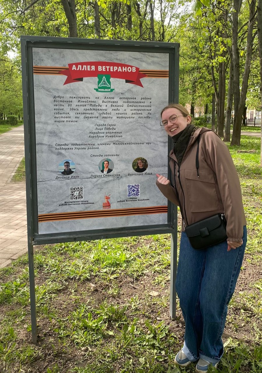 2 июня 2025 года Здравствуйте, друзья! Измайловский бульвар в Москве протянулся от 3-й до 15-й Парковой улиц параллельно Первомайской улице. Чуть более 10 лет назад на нём была организована Аллея ветеранов, оформленная стендами с информацией об участниках Великой Отечественной, проживавших в этом районе Москвы. Постепенно Аллея становилась всё длиннее, и вот в этом году была открыта самая дальняя её часть, от 11-й до 15-й Парковых улиц. Такие места памяти героев есть во многих районах столицы, да и других городов нашей страны, но эта аллея примечательна тем, что в её оформлении принимала участие моя внучка Юля, будущий историк, а пока что студентка 1-го курса Педагогического Университета. На фото вы видите крупным планом мою внучку, а если приглядитесь, то увидите и её портрет, как автора, участвовавшего в подготовке информационных стендов. По Аллее ветеранов мы прошли с другой моей внучкой, Олесей, которая сейчас готовится защищать диплом и поступать в магистратуру, и которая заслуж