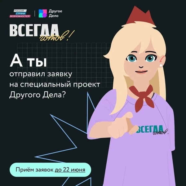 Сидишь и думаешь чем заняться этим летом? Есть идея! 4-й сезон спецпроекта «Всегда готов!» ждёт твою заявку! «Всегда готов!» ежегодный спецпроект «Другого Дела» для подростков от 14 до 17 лет. Он помогает раскрыть потенциал и развить способности с помощью творческих конкурсов и заданий. Залетай на сайт и оставляй заявку https://vk.cc/cM5bZ4. 1-й конкурсный этап продлится до 12:00 22 июня. 200 победителей получат поездку на образовательную программу под руководством опытных менторов, мерч проекта, опыт создания UGC-контента и незабываемый вайб летнего лагеря. «Всегда готов!» это не просто спецпроект, это настоящее комьюнити единомышленников. Присоединяйтесь! P.S. «Другое Дело» проект-агрегатор, который собирает добрые, полезные, развивающие и интересные дела, за выполнение которых можно получить баллы https://t.me/vsegdagotov_drugoedelo #ДругоеДелоВсегдаГотов #РоссияСтранаВозможностей Источник https://uchaly102.ru/?p=84704