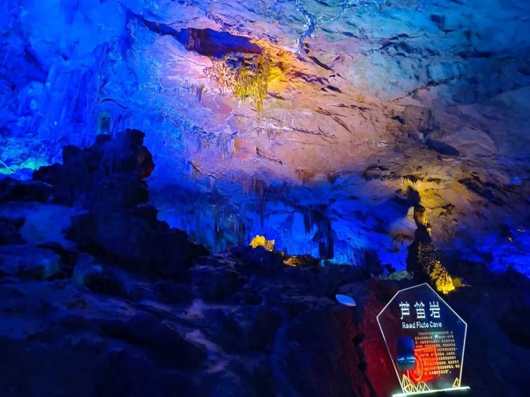 Сталагмиты, сталактиты, каменные колонны, каменные занавеси и каменные цветы в пещере Тростниковой флейты завораживают, образуя Утреннее сияние Львиного хребта, Красный шелковый шатер сокровищ, пагоду Панлонг, Первобытный лес, Хрустальный дворец, Цветочно-фруктовую гору и другие пейзажи, которые завораживают туристов и напоминают волшебную страну. Его называют «Дворцом искусства природы».