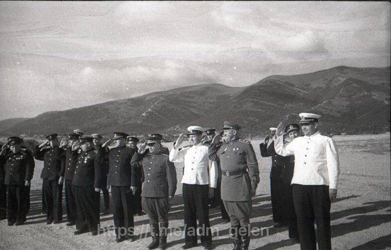 Продолжение, часть 6. Торжественный марш после вручения Гвардейского Красного Знамени, 1943 год. Геленджик Контр-адмирал Кулаков, генерал-лейтенант Петров, вице-адмирал Владимирский, генерал-лейтенант Леселидзе, генерал-лейтенант Ермаченков. С октября 1942 г. генерал-лейтенант И.Е. Петров — в первом ряду второй справа — возглавлял Черноморскую группу войск Закавказского фронта, а с мая 1943 г. Северо-Кавказский фронт. В августе 1943 года ему было присвоено звание генерал-полковника, а в октябре того же года — генерала армии. 5 февраля 1944 года вышел Указ Президиума Верховного Совета СССР «Об утверждении нового образца Красного Знамени, Гвардейского Красного Знамени войсковых частей и соединений Военно-Морского Флота». Автор снимка: Бродский А. И. #Геленджик_Победа80 #80ЛетПобедаКубань