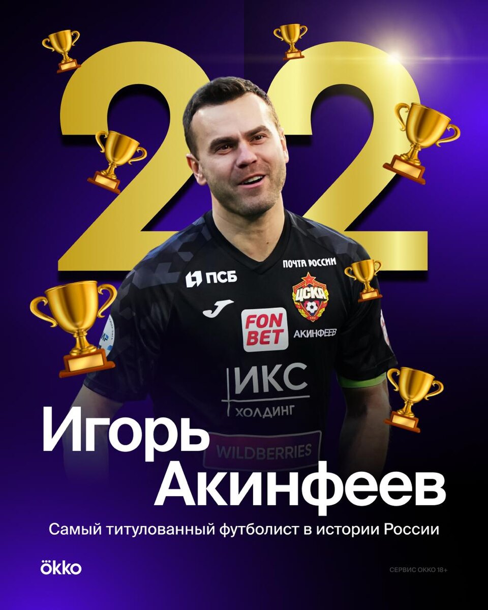 В ответ на пост 22 трофея за карьеру. Великий Акинфеев 🏆 Теперь Игорь самый титулованный российский футболист. Благодаря победе в Кубке России голкипер ЦСКА обогнал по числу трофеев Игнашевича и Жиркова. 👏 — лучший!