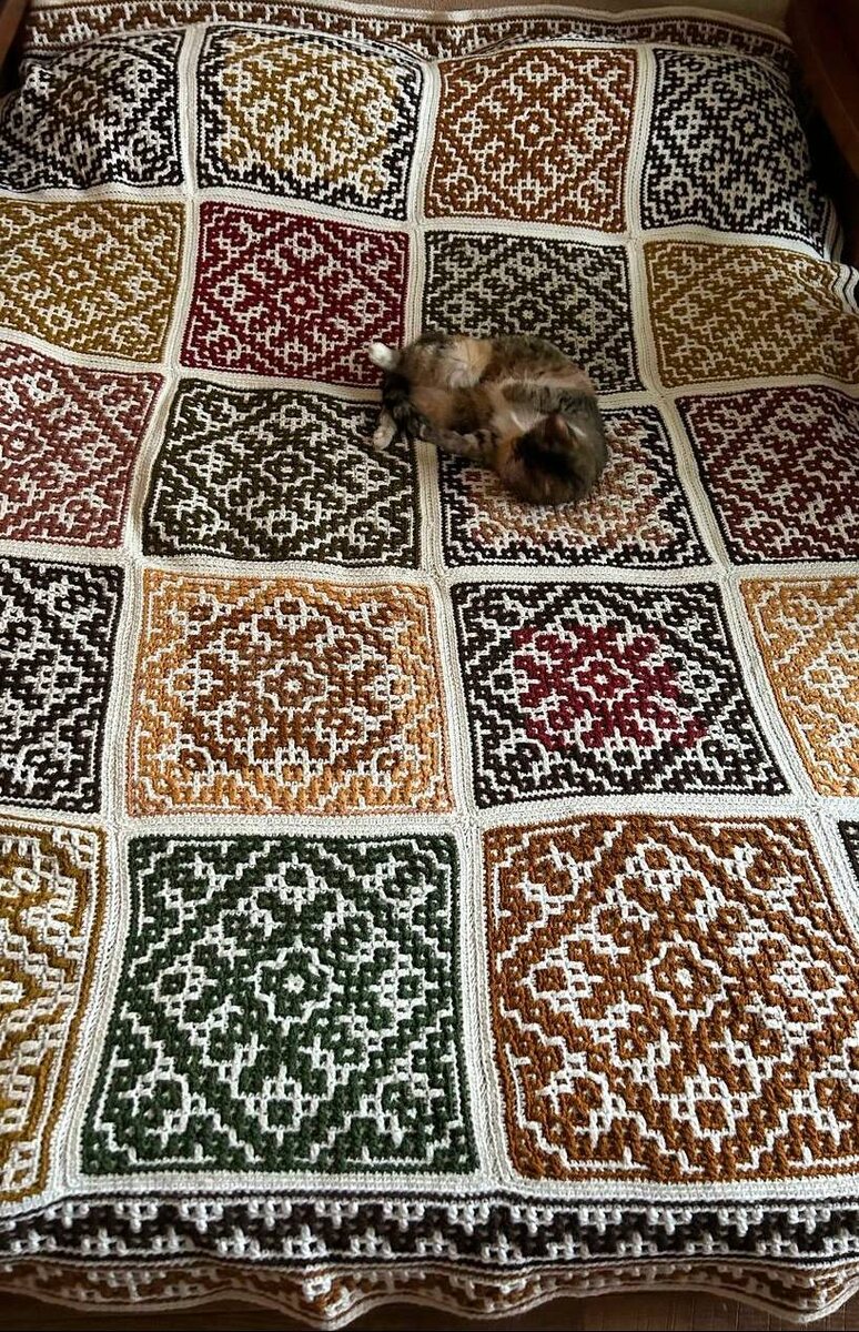 Плед из мотивов. Новости наших чатов Увидела этот уютный плед в ветке, где пряжа обсуждается, в чате «Нескучный плед». Работа Елены🔥 Елена: «Я вязала большой плед из квадратов из всего, что у меня набралось за 30 лет, состав шерсть, полушерсть, акрил, крутка разная, разную толщину приводила к более-менее подобной, кого в несколько сложений, кого в две нити, кого в одну. Получилось вполне норм, особенно после прогона в машинке». Схему мотива ищите в чате «Квадрат в день»: https://t.me/kvadratgendina
