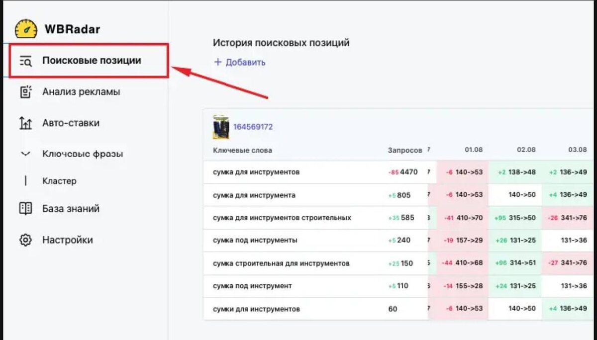 💲Добрый вечер, коллеги. Хотим напомнить, что в WBRadar есть полезная опция. Это Поисковые позиции. С помощью этой вкладки, вы можете как отслеживать свои позиции, так и следить за перемещением конкурента по важным для вас поисковым запросам. Подготовка к сбору данных 1️⃣Нажимаем на вкладку "Поисковые позиции" на главной странице 2️⃣Нажимаем кнопку “+ добавить”, вводим поисковые запросы и артикулы для отслеживания и нажимаем синюю кнопку "Добавить". 3️⃣Примерно через сутки появятся данные за предыдущий день 📍В колонке "Запросов" показана частотность запроса за последние 7 дней. Если значение в ячейке со стрелочкой "->", значит, что в момент обновления данных, ваш товар в запросе рекламировался. Слева от стрелки - органическая позиция, справа - позиция с учетом рекламы. Значения с + и - это разница в органической позиции с предыдущим днем. Бот просматривает 1100 позиций. Если артикул по запросу будет занимать место, дальше чем 1100, то в колонке по дню будет стоять “-” (прочер