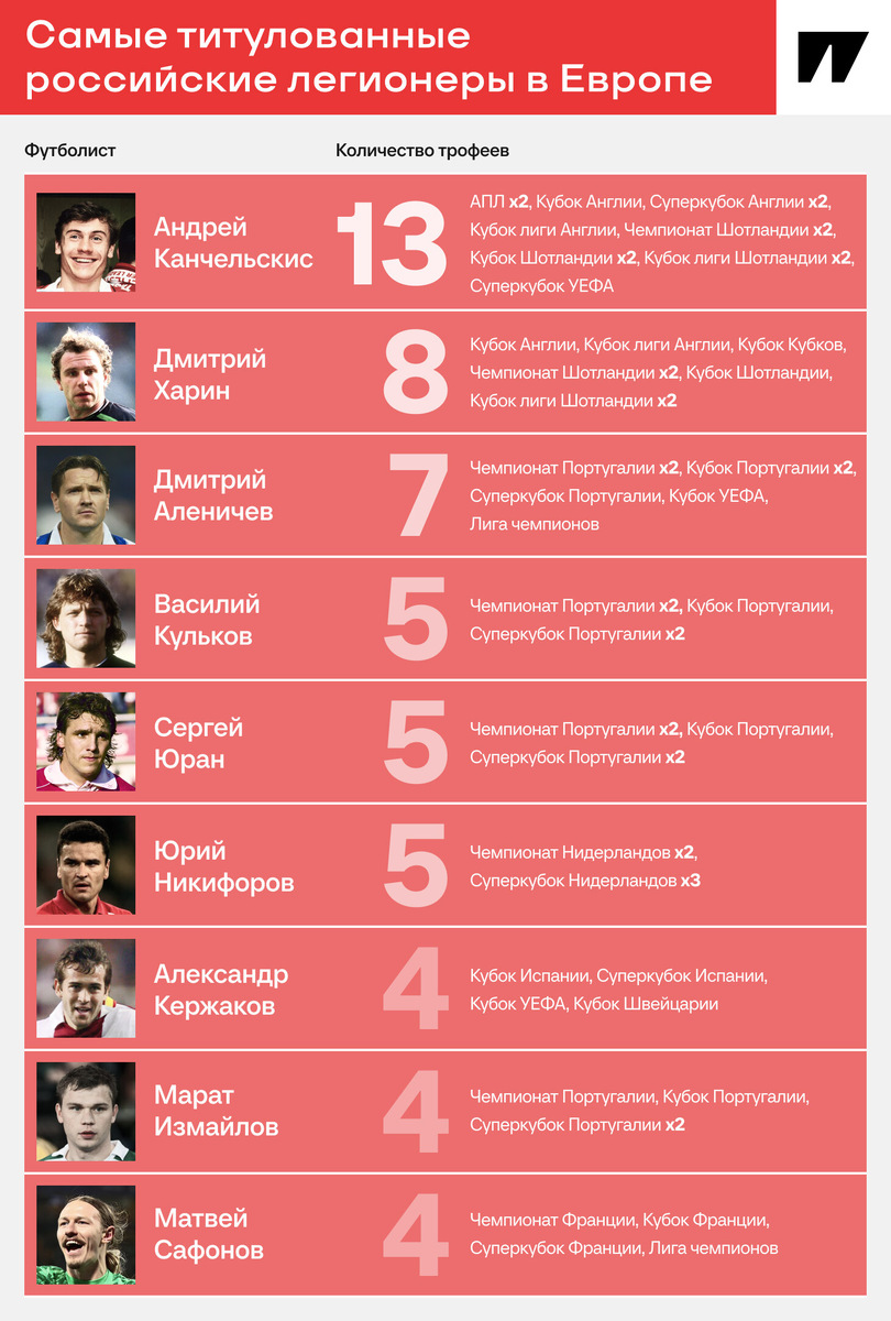 В следующем сезоне можно приблизиться. Матвей Сафонов выиграл четыре трофея за сезон с «ПСЖ» – и это не предел: впереди клубный чемпионат мира, а затем и новые турниры, где парижане будут фаворитами. С четырьмя победами Сафонов пока далеко не самый титулованный российский футболист за рубежом. Но старт отличный. Важно: разные источники по-разному считают количество трофеев, особенно это касается Суперкубков. Поэтому в них могут быть расхождения. ● Андрей Канчельскис насобирал наград в Великобритании. Выиграл все в Англии за «МЮ» и даже успел зацепить Суперкубок УЕФА. Еще шесть чашек взял в Шотландии, играя за «Рейнджерс». ● Дмитрий Харин следовал примерно по тому же пути, только в меньших масштабах: в Англии был «Челси», затем дополнил коллекцию в «Селтике» – хотя за три сезона сыграл всего 11 матчей. ● Дмитрий Аленичев, Василий Кульков и Сергей Юран навезли наград из Португалии – в основном из «Порту», где выступали втроем. При этом Аленичев стал еще и прямым участником победных еврок