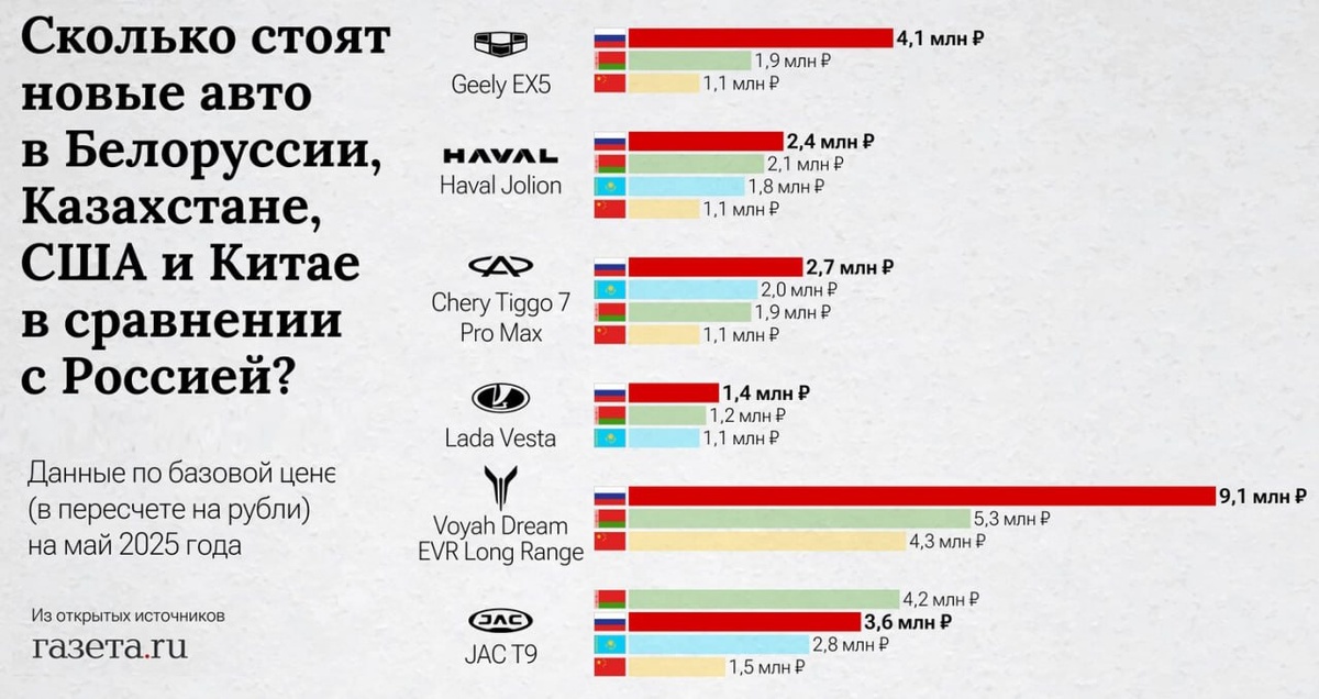 Примечательную инфографику составили коллеги из "Газеты ру", сравнив цены на одни и те же автомобили в России, Казахстане, Беларуси и Китае