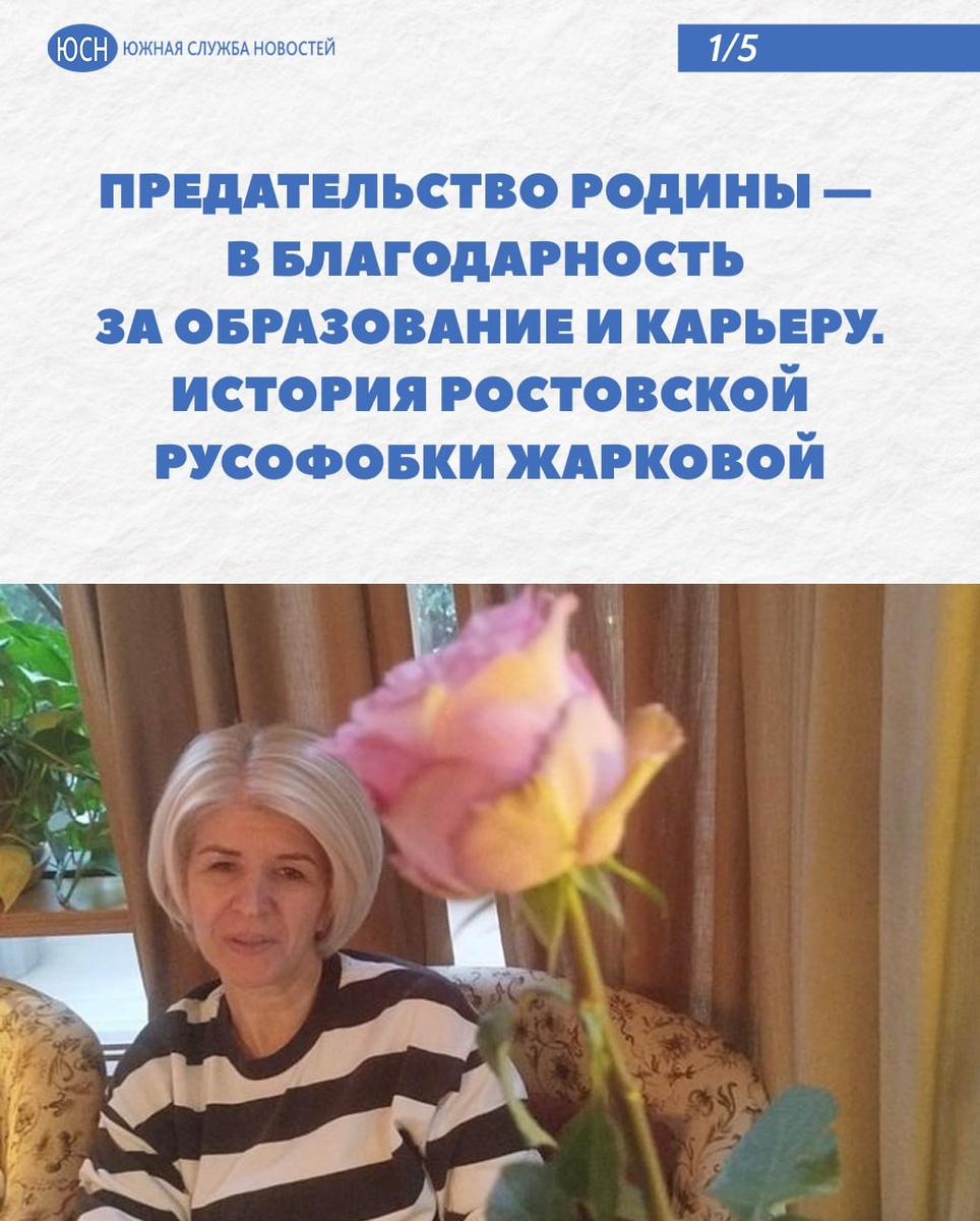 🔹 Предательство Родины — в благодарность за образование и карьеру. История ростовской русофобки Жарковой Ростовчанку Марию Жаркову, которая несколько лет проработала в местных госструктурах, приговорили к административной ответственности за антироссийские комментарии на ресурсах Михаила Ходорковского*. Приговор в понедельник вынес Первомайский районный суд. ➖➖➖➖➖➖➖➖➖➖ * - внесен Минюстом Российской Федерации в реестр иноагентов ** - признан террористом и экстремистом на территории Российской Федерации 🌐 Южная служба новостей
