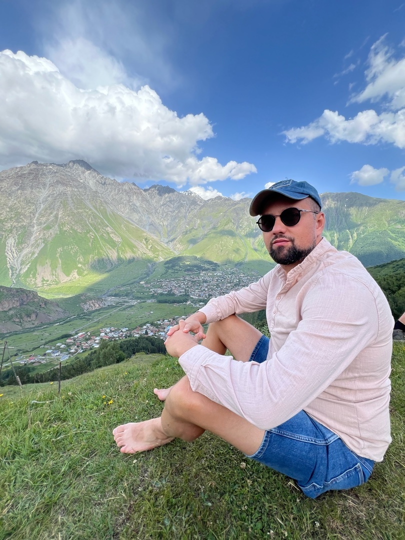 Сидеть на вершине горы с видом на Казбек и поселок Степанцминда — это настоящее волшебство. Ты словно оказываешься на грани между землей и небом, где свежий горный воздух наполняет легкие, а тишина и спокойствие окружают со всех сторон. Внизу раскинулся уютный Степанцминда с его домиками и зелеными лужайками, а впереди — величественный Казбек, покрытый снежными шапками и отражающийся в лучах солнца.