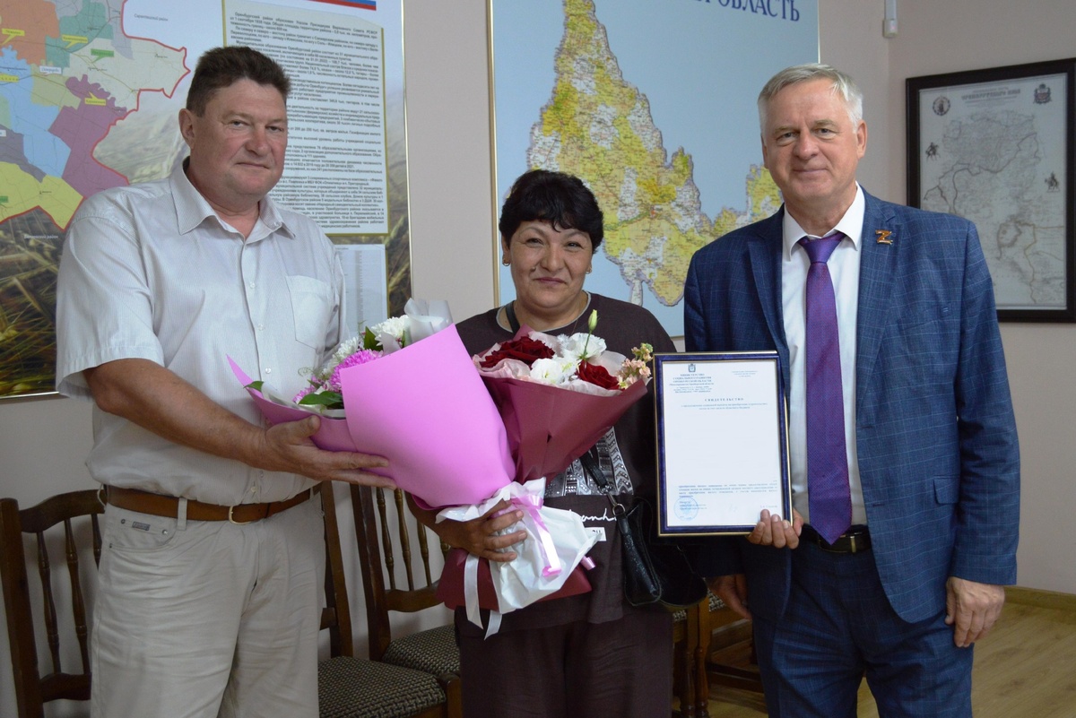 В Оренбургском районе многодетной матери Канзие Шакаровой, воспитывающей 9 детей, вручили сертификат на жилье. Церемонию провел глава района Василий Шмарин. Канзия, более 20 лет работающая в колхозе им. Ю.А. Гагарина, не планирует уезжать из села Караванного.