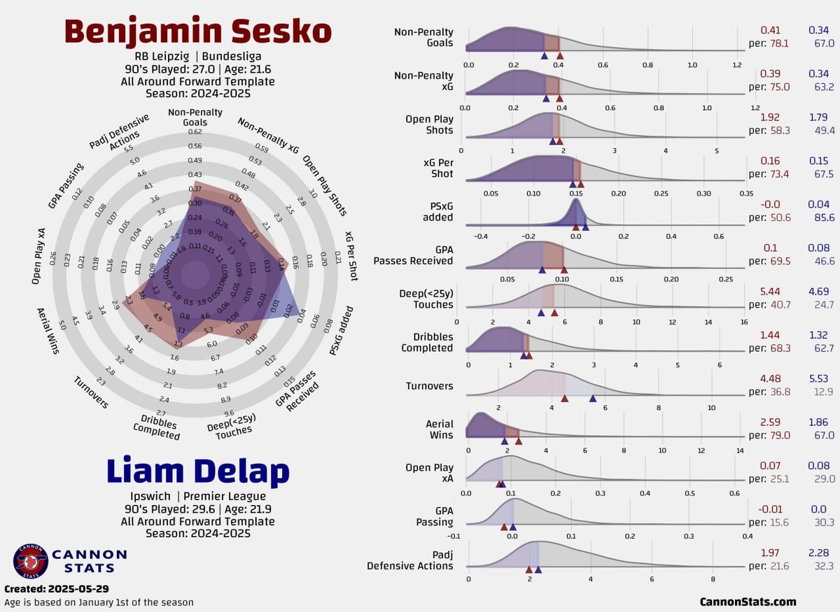 В ответ на пост Вот где Лиам Делап заметно лучше Беньямина Шешко по данным за сезон 2024/2025 1. Борьба в воздухе — Делап сильнее физически 🔵 Делап выигрывает в среднем 2.59 верховых дуэлей, у Шешко — 1.86. Это важно для борьбы за мячи после навесов и выносов. 2. Глубокие касания — Делап чаще опускается за мячом 🔵 У Делапа 5.44 касания в зоне ниже 25 ярдов от ворот соперника — у Шешко 4.69. Это значит, Делап чаще помогает команде в сборке атаки. 3. Дриблинг — Делап обостряет чаще 🔵 Делап совершает 1.44 успешных обводки за матч, Шешко — 1.32. Разница не огромная, но Делап чуть активнее в попытках пройти соперника. 4. Прессинг и отборы — Делап более агрессивный в защите 🔵 У Делапа 1.97 защитных действий, у Шешко — 2.28, но у Делапа выше перцентиль (21.6 против 32.3) — значит, на фоне своей лиги он эффективнее. 5. Получение пасов в выгодных позициях — Делап врывается лучше 🔵 GPA Passes Received — у Делапа 0.10, у Шешко 0.08. Это показатель, как часто игрок получает умные пасы —