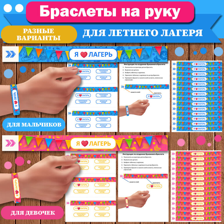 - Сине-голубые браслеты для мальчиков. Необходимо их распечатать на принтере, вырезать детали, выбрать табличку с надписью, всего их четыре: «Я люблю лагерь», «Территория улыбок», «Территория радости», «Дружный отряд» (надписи можно отредактировать на своё усмотрение, комплект дополнен редактируемым файлом PPTX-формата). Приклеить табличку по центру браслета, а затем склеить, подогнав по размеру запястья.