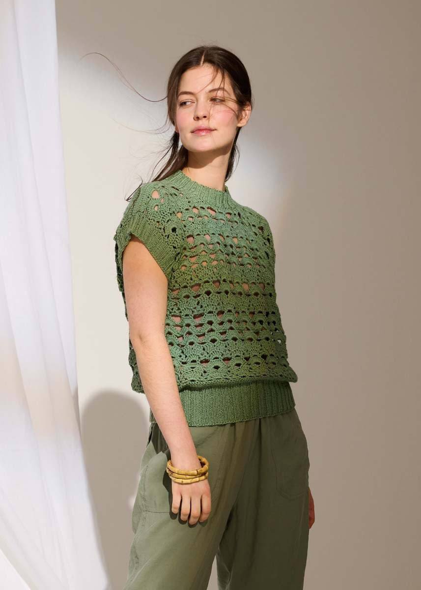 - Льняная пряжа — настоящая находка для тех, кто ценит лёгкость и текстуру. Лён отличается высокой прочностью и структурной жёсткостью, поэтому изделия из него имеют неповторимый вид. Льняные топы выглядят естественно, стильно и обладают приятным охлаждающим эффектом. Они идеальны для летних прогулок и создают ощущение прохлады даже в самый жаркий день.