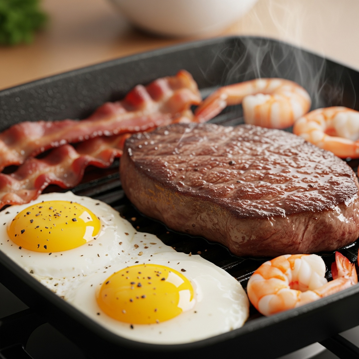 - Жареные яйца с беконом: Сочетание яиц и жирного бекона (или сала) является классическим и эффективным способом получить достаточно жира. Можно жарить яйца прямо на вытопленном жире от бекона.