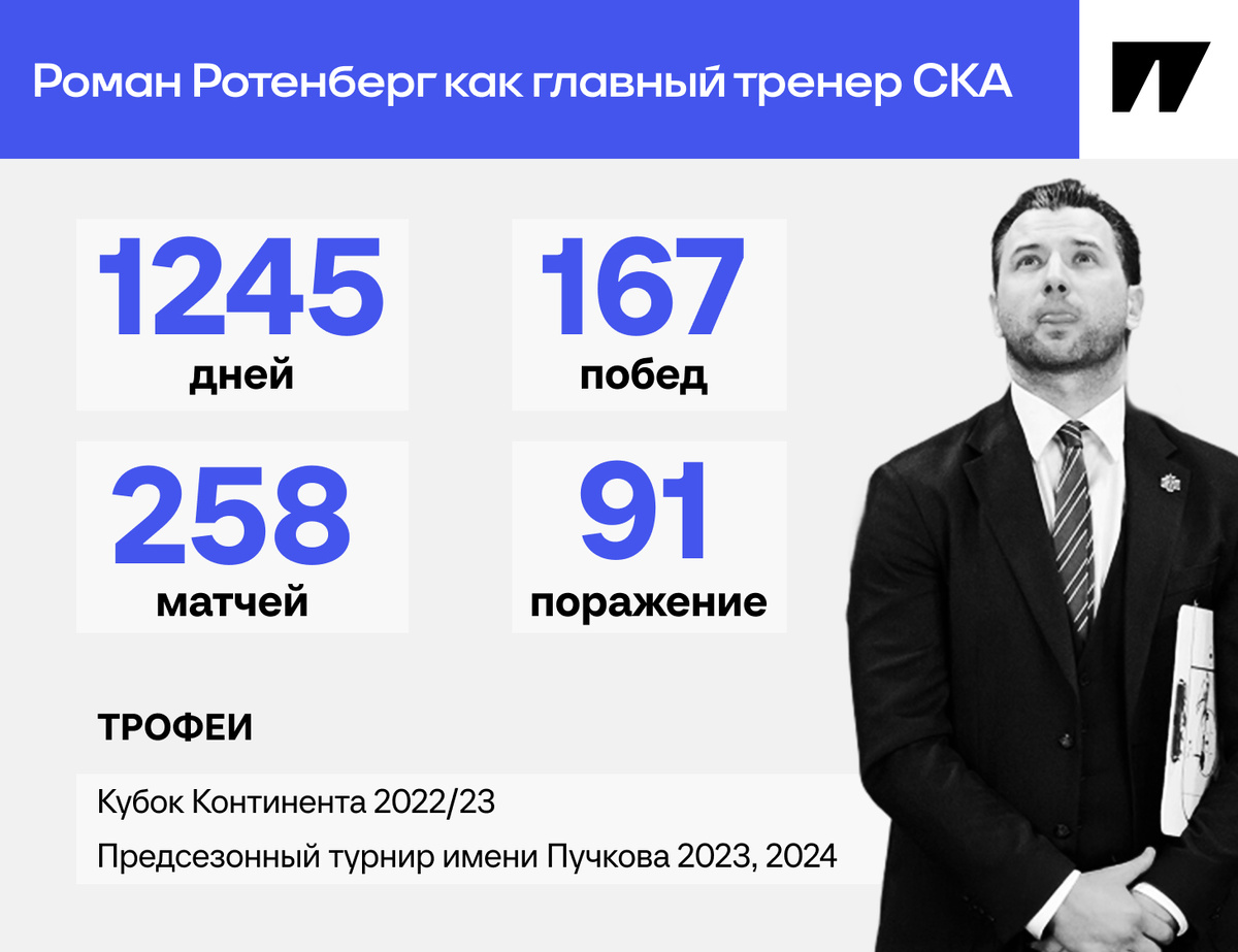 1245 дней с Романом. Ушла эпоха – Роман Ротенберг отставлен с поста главного тренера СКА. Во время его царствования десятки игроков, имея действующие контракты, покинули клуб. Теперь та же участь настигла самого Ротенберга. В июле-2023 тренер продлился на пять лет, но отработал меньше половины. Роман получил назначение на должность в начале январе-2022. Все последующие дни он много говорил и часто опирался на статистику. Таблицы (которые возглавляет СКА) – самый популярный формат в его личном телеграм-канале. Если бы Ротенберг делал подсчеты беспристрастно, то уже давно выложил бы графику с главными цифрами: Все что, кроме нашего внимания, выиграл Ротенберг в СКА – два предсезонных турнира в Санкт-Петербурге и Кубок Континента, о котором, скажем честно, мало кто мечтает. Впрочем, по результатам гладкого чемпионата очевидно, что тренер регрессировал год от года. В первом полноценном сезоне выиграл регулярный чемпионат, во втором остановился в одном шаге от лидерства, а в третьем потерял